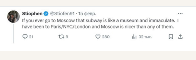 Если вы когда-нибудь поедете в Москву, то увидите, что метро похоже на музей и безупречно. Я был в Париже/Нью-Йорке/Лондоне, и Москва лучше любого из них,