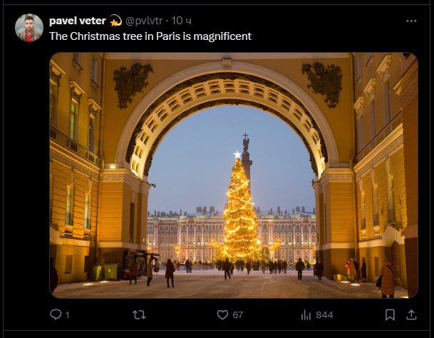 "Рождественская ёлка в Париже великолепна", - заявил Pavel Veter, приложив фото Питера.