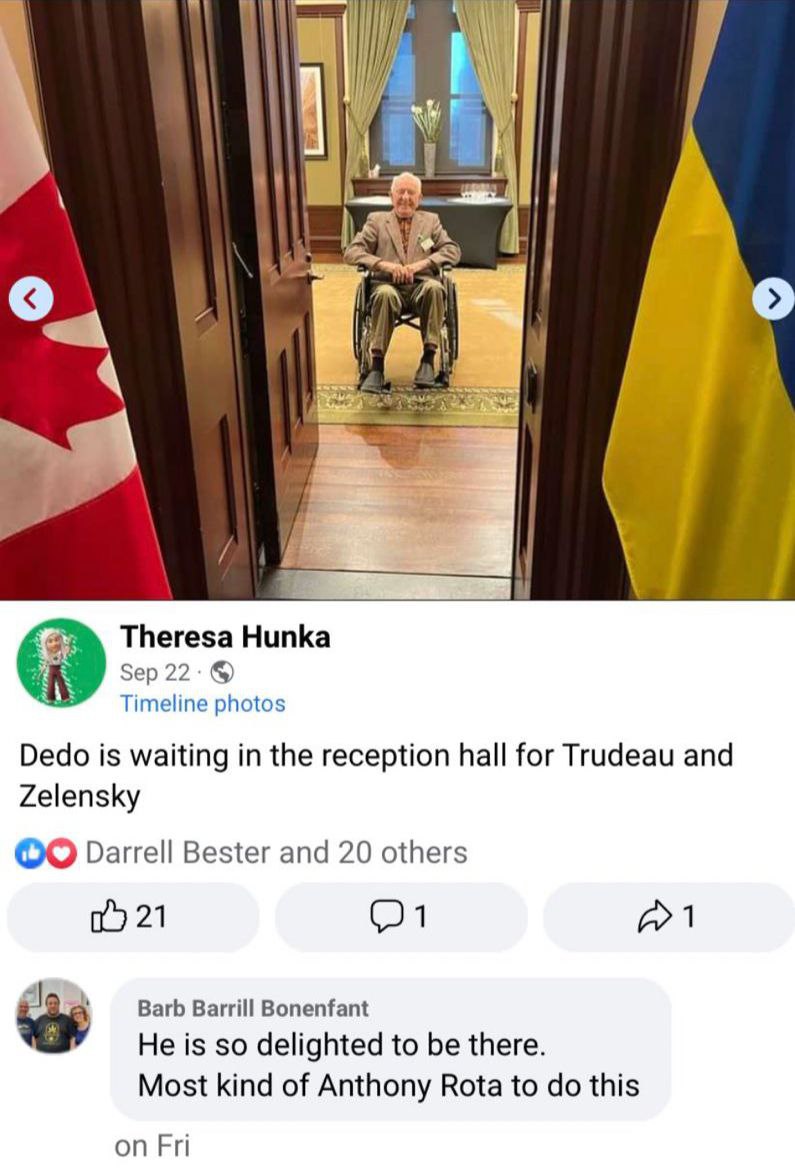 Энтони Рота может оправдываться как угодно, но, как говорится, интернет всё помнит. В пятницу внучка Хунки поделилась в своей социальной сети публикацией, к которой прикреплена фотография бывшего эсэсовца и подпись "Дедо ожидает в приёмной Трюдо и Зеленского".