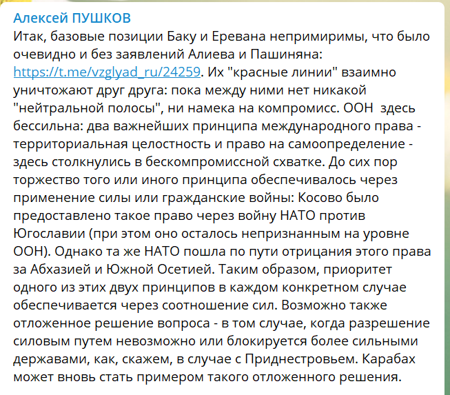 Член Совфеда Алексей Пушков прокомментировал заявления премьера Армении и президента Азербайджана о "красных линиях", назвав военные действия в Карабахе "бескомпромиссной схваткой". Сенатор заявил, что Карабах может вновь стать примером отложенного решения, если силовым путём конфликт разрешить не удастся.