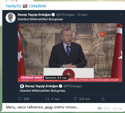 А автор Telegram-канала "Пальто Сухейля" опубликовал скриншот выступления Эрдогана и, не удержавшись, тоже иронично поддел турецкого лидера.