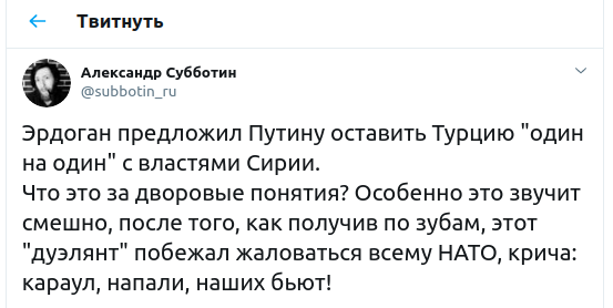 Президент Реджеп Тайип Эрдоган заявил о том, что предложил своему российскому коллеге Владимиру Путину оставить Турцию "один на один" с сирийскими властями. В Сети изумились такому дерзкому предложению. Писатель Субботин даже иронично поддел турка: "Особенно это звучит смешно после того, как, получив по зубам, этот "дуэлянт" побежал жаловаться всему НАТО, крича: "Караул, напали, наших бьют!"