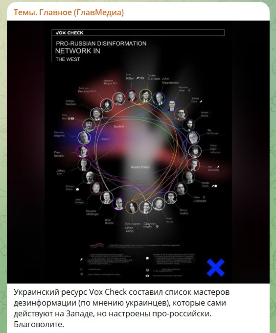 По мнению украинского ресурса Vox Check, в перечень мастеров дезинформации стоит включить всех, кто действуют на Западе, но настроен прорусски. "Тут все наши - Такер Карлсон, Скотт Риттер, Джон Миршаймер, Джексон Хинкл, Джимми Дор, Рассел Брэнд, Макс Блюменталь, Гленн Гринвальд, Джеффри Сакс и другие, - отмечает телеграм-канал "Темы. Главное (ГлавМедиа)". - Прекрасная, с любовью составленная подборка по теме "Что почитать?".