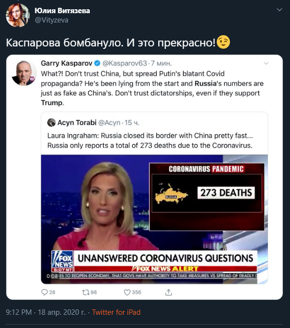 Телеканал Fox News призвал губернатора Нью-Йорка равняться на президента России Владимира Путина в вопросах борьбы с коронавирусом. Это заявление возмутило оппозиционера Гарри Каспарова. "Каспарова бомбануло", - пошутила журналистка Юлия Витязева.
