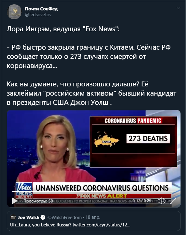 В одном из выпусков Ингрэм решила похвалить Россию, которая закрыла границу с Китаем в тот момент, когда пандемия коронавирусной инфекции активно продвигалась с Востока на Запад. Это и другие инициативы позволили избежать повторения "американского" и "итальянского" сценариев: вместо тысяч погибших счёт пока идёт на сотни.