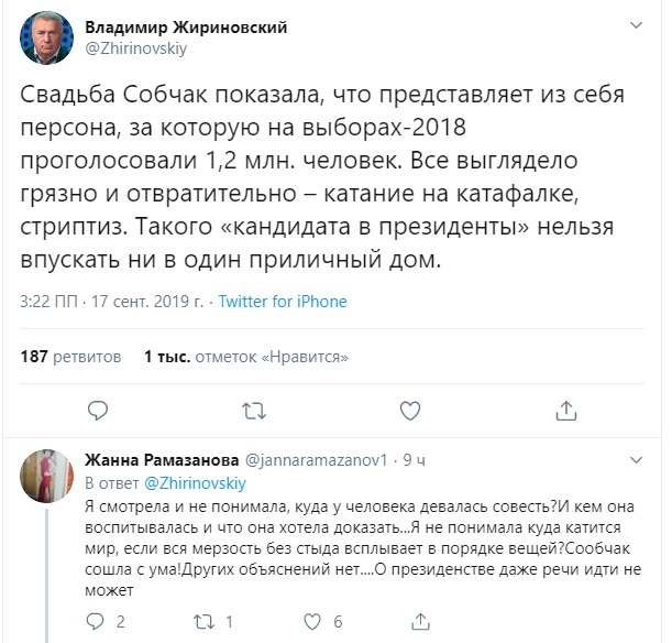 "Свадьба Собчак показала, что представляет из себя персона, за которую на выборах-2018 проголосовали 1,2 млн человек. Все выглядело грязно и отвратительно – катание на катафалке, стриптиз. Такого "кандидата в президенты" нельзя впускать ни в один приличный дом, - возмутился Жириновский в своем твиттере.