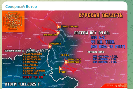 Наши части продолжают сжимать со всех сторон группировку ВСУ в районе Суджи. Причём, проседание у противника идёт сразу на нескольких участках курского фронта,