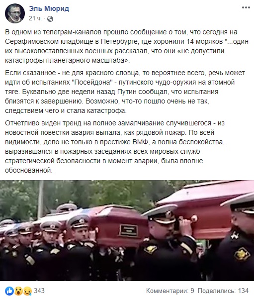 "Если сказанное - не для красного словца, то, вероятнее всего, речь может идти об испытаниях "Посейдона" - путинского чудо-оружия на атомной тяге, - пишет так называемый блогер. - Буквально две недели назад Путин сообщал, что испытания близятся к завершению. Возможно, что-то пошло очень не так, следствием чего и стала катастрофа".