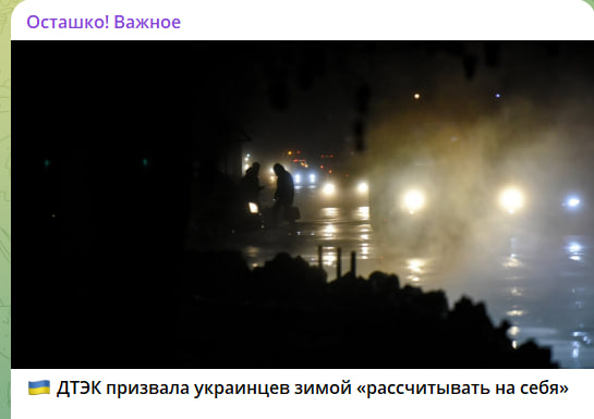 Крупнейшее энергетическое предприятие Украины ДТЭК официально подтвердило катастрофическое состояние всей критической инфраструктуры. Исполнительный директор энергетической компании Дмитрий Сахарук призвал местное население грядущей зимой "надеяться на себя".
