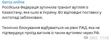 С таким заявлением в четверг выступил депутат Верховной рады Андрей Герус. Он утверждает, что Россия остановила транзит казахского угля на Украину, в результате чего забронированное на ноябрь сырьё не может достичь места назначения. При этом парламентарий подчеркнул, что речь идёт об угле, который используется при работе ТЭЦ, а не о коксующемся угле.