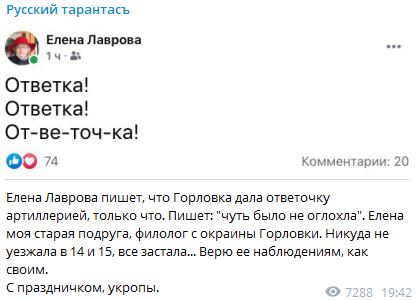 "Елена Лаврова пишет, что Горловка дала ответочку артиллерией только что. Пишет: "Чуть было не оглохла". Верю её наблюдениям как своим", - отмечает журналист в Telegram.