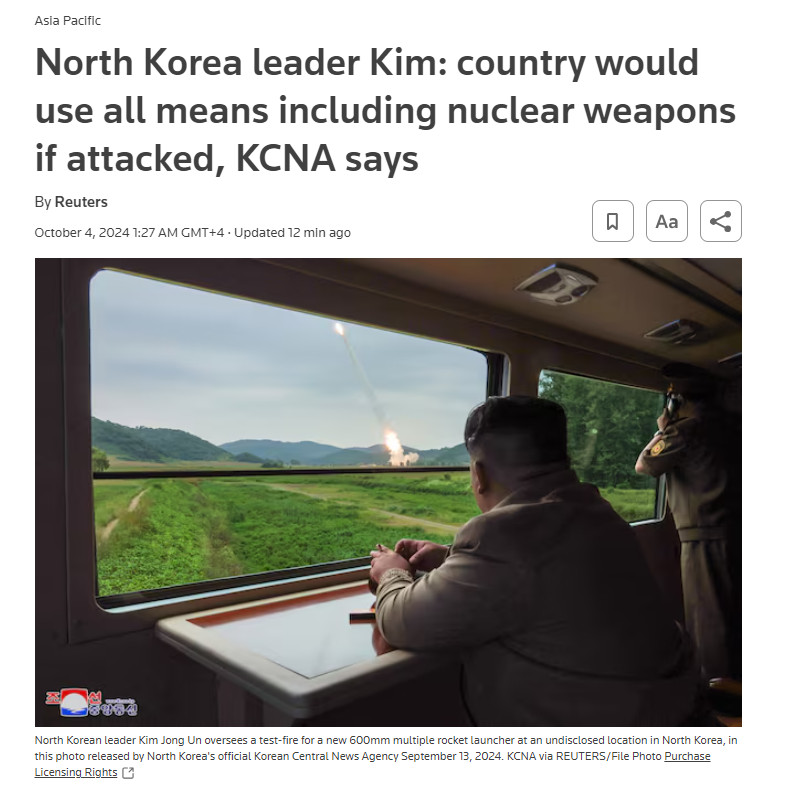 Лидер КНДР заявил, что страна "без колебаний использует все доступные наступательные силы", включая ядерное оружие, если враг попытается применить силу для посягательства на её суверенитет.