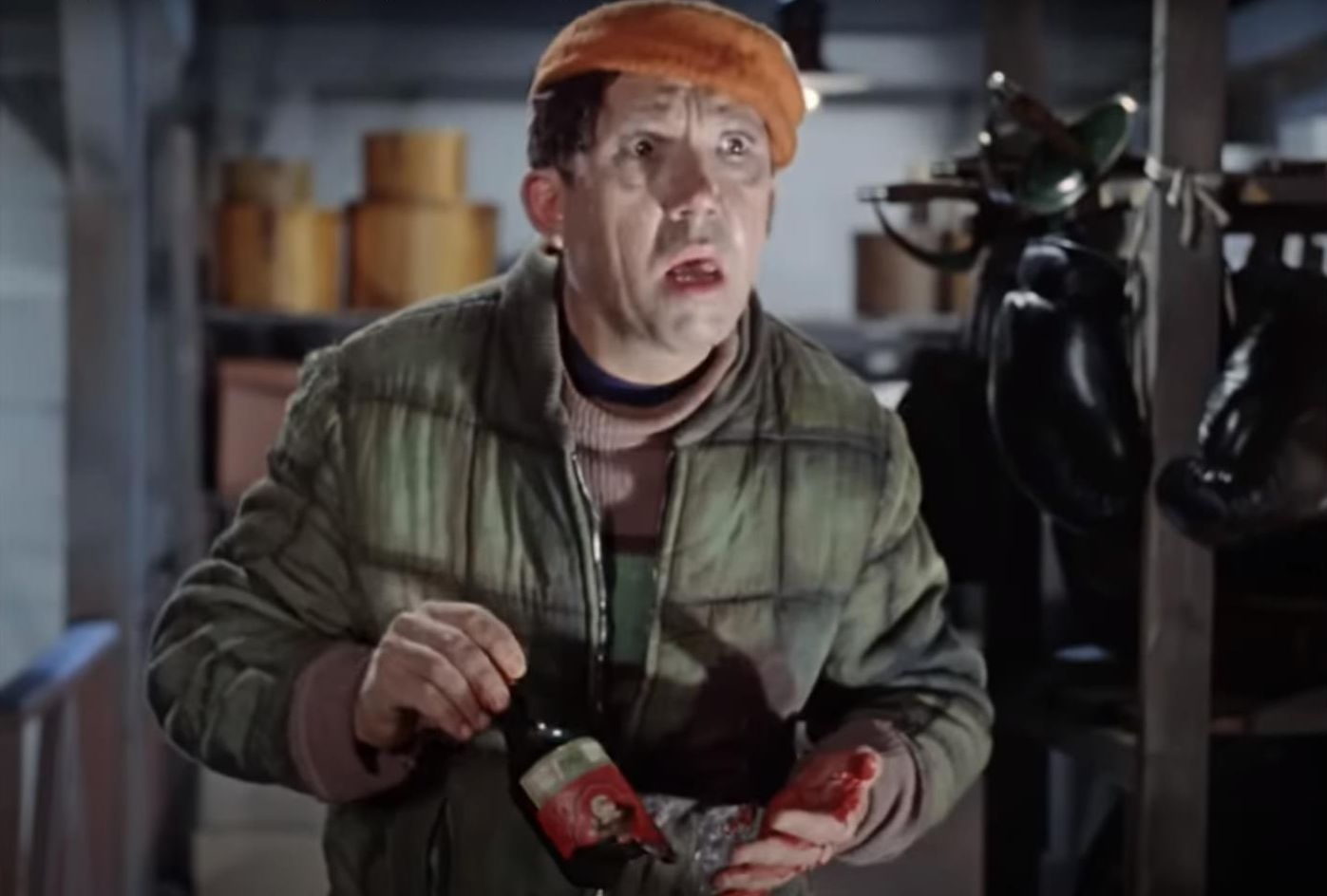 На руке Балбеса красная жидкость из разбитой бутылки. Кадр из фильма "Операция "Ы" и другие приключения Шурика" (1965, режиссёр Леонид Гайдай)
