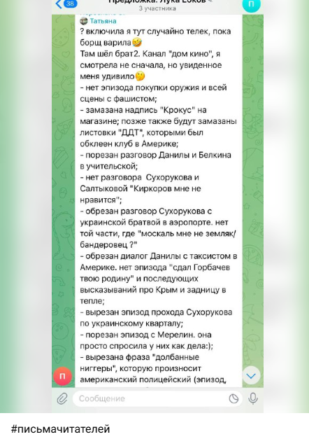 Об этом пишет зрительница Татьяна: на одном из телеканалов она смотрела "Брат-2" и поразилась, как много сцен загадочным образом "пропали", будто их и не было. Среди них - эпизод покупки Данилой оружия у мужчины, явно поклоняющегося идеям нацизма; замазаны некоторые надписи на магазинах и листовки русской рок-группы на американском клубе; стычка героя Сухорукова и украинцев в аэропорту тоже сильно "вычищена" и пр.
