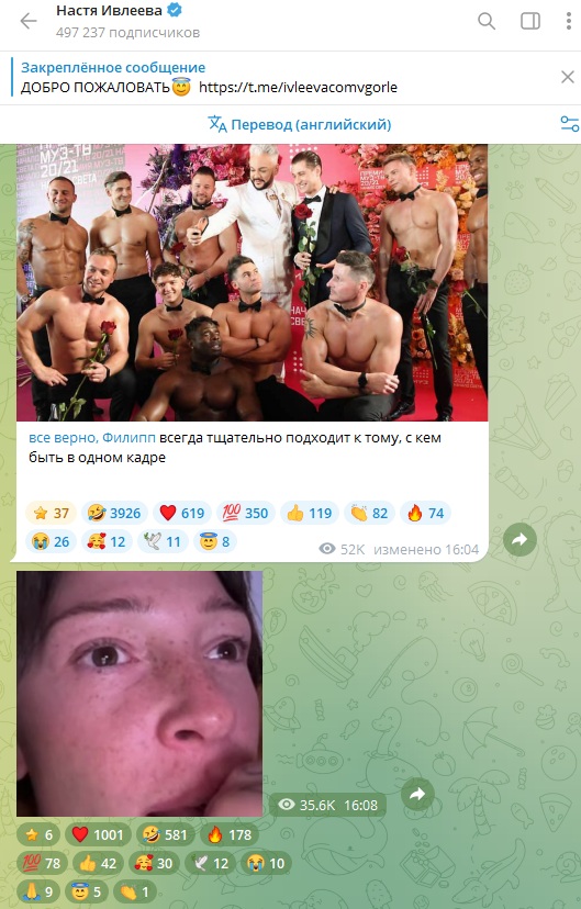 Но отвлечёмся от "газпромовских" ТВ-проектов. Как оказалось, Анастасия Ивлеева, или, как она сама себя называет, "Настюшка-опасность", может весьма изящно троллить оппонента. "Выслушав" Киркорова с его обзывательствами и сообщениями об ультиматуме с местью наперевес, телеведущая оставила короткий пост в телеграм-канале - фото с подписью: