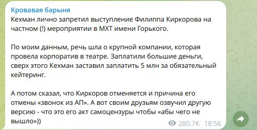 Кехман лично запретил выступление Филиппа Киркорова на частном (!) мероприятии в МХТ имени Горького, - написала Собчак (публикуем с сохранением орфографии и пунктуации). - По моим данным, речь шла о крупной компании, которая провела корпоратив в театре. Заплатили большие деньги, сверх этого Кехман заставил заплатить 5 млн за обязательный кейтеринг. А потом сказал, что Киркоров отменяется и причина его отмены "звонок из АП (аппарат президента - ред.)". А вот своим друзьям озвучил другую версию - что это его акт самоцензуры чтобы "абы чего не вышло".
