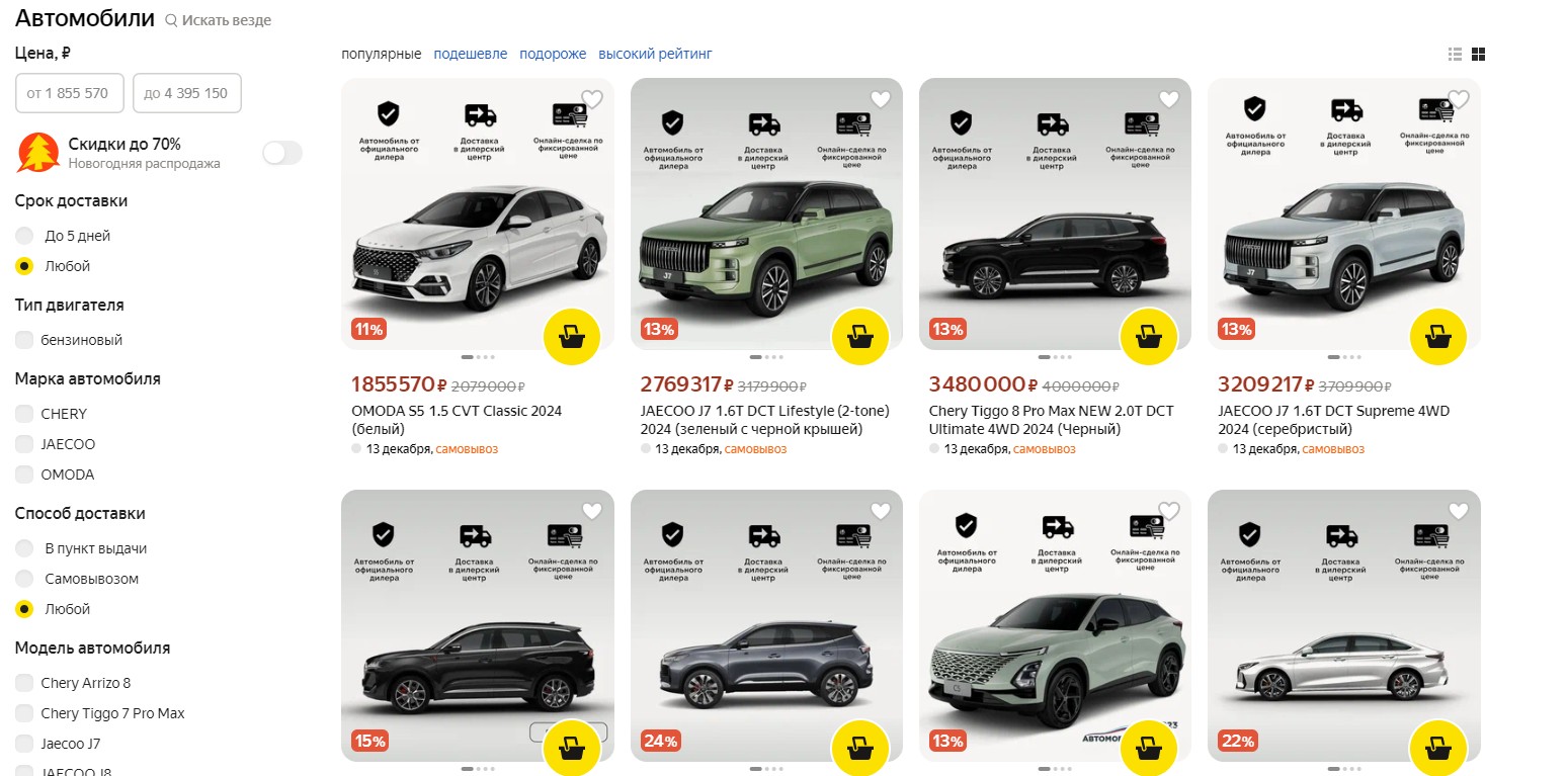 На электронной торговой площадке «Яндекс Маркет» появились автомобили. Теперь в каталоге представлены китайские марки «Chery», «Jaecoo» и «Omoda». Компания планирует начать сотрудничать и с другими производителями и дистрибьюторами.