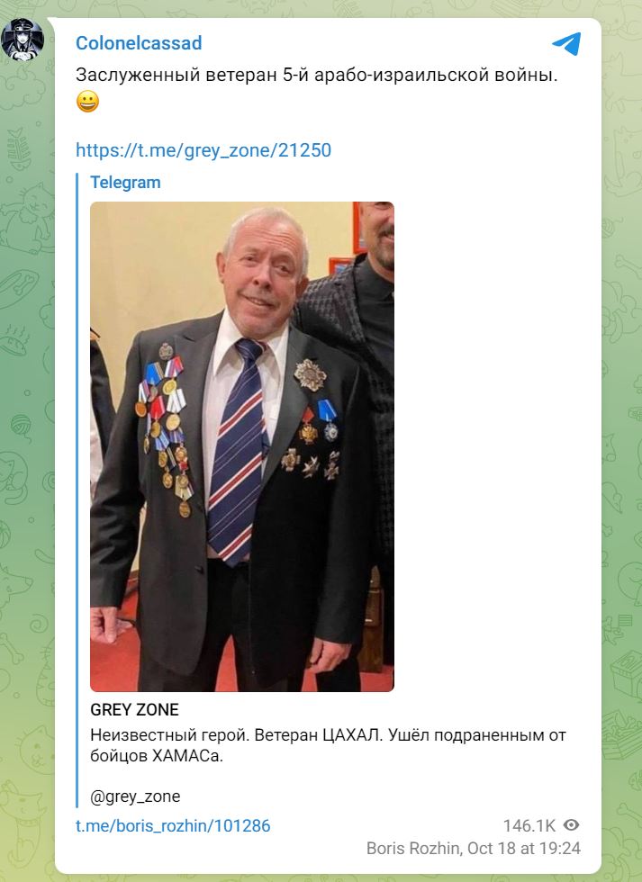 "Неизвестный герой. Ветеран ЦАХАЛ. Ушёл подраненным от бойцов ХАМАС", - шутит автор телеграм-канала Grey Zone.