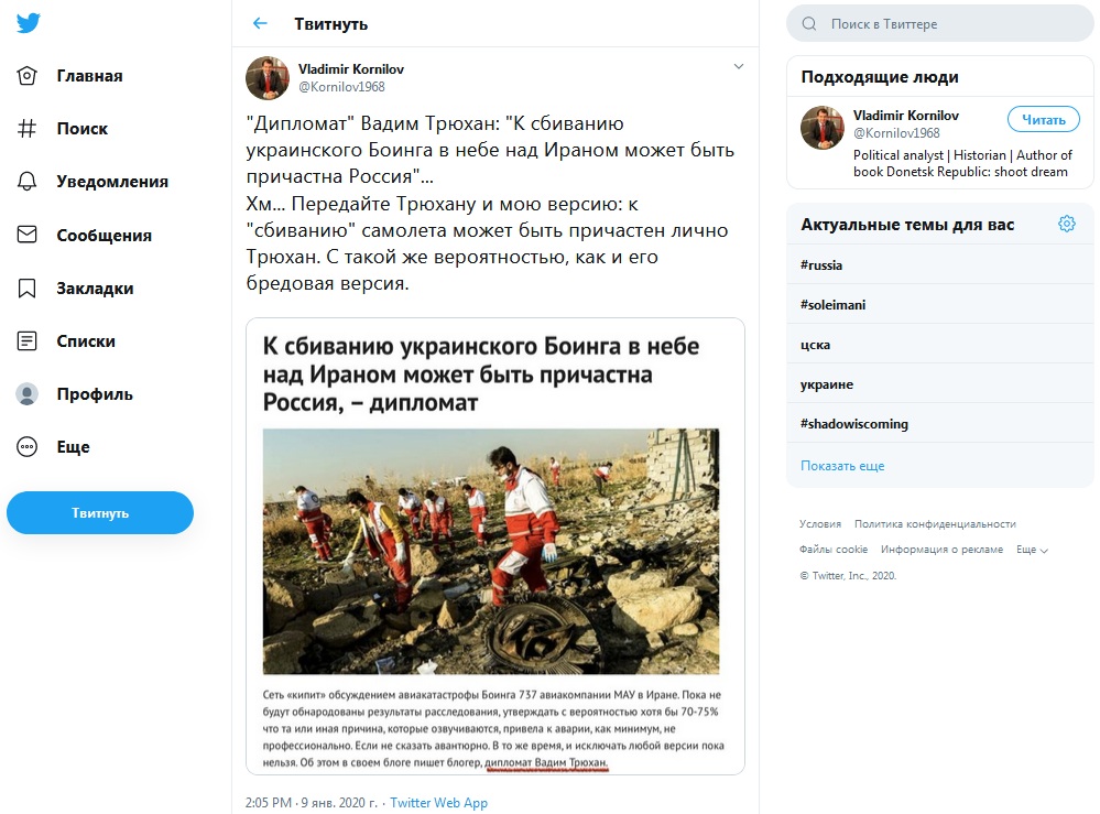 В Иране ещё не успели расшифровать записи с черных ящиков разбившегося в Тегеране украинского Boeing 737, а в катастрофе уже обвинили Россию. С соответствующими заявлениями выступил украинский блогер и дипломат Вадим Трюхан.