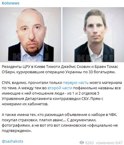 По его словам, речь идёт о работавших в Киеве резидентах ЦРУ Тимоти Джеймсе Сковине и Брайане Томасе О’Берне. Коц также утверждает, что к охоте на богатырей были привлечены сотрудники первого, второго и пятого отделов управления департамента контрразведки СБУ. В своей статье, опубликованной осенью прошлого года, он указал конкретную информацию о них, вплоть до номеров кабинетов.