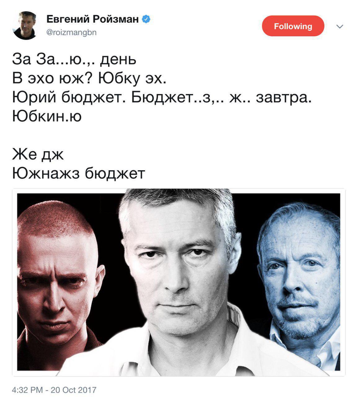 К сообщению было прикреплено изображение самого Ройзмана, стоящего спиной к известному в России рэперу с псевдонимом Oxxxymiron и когда-то популярному российскому рок-музыканту Андрею Макаревичу. Примечательно, что лицо рэп-исполнителя окрашено красным фильтром, а лицо либерального рокера - голубым. Сам Ройзман изображен в черно-белых тонах.