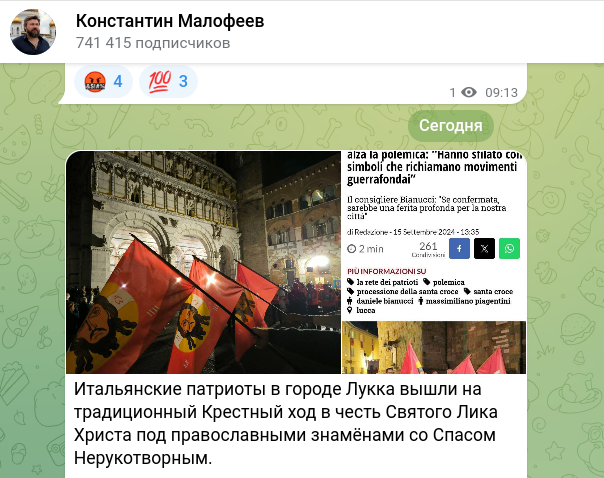 Ранее итальянские патриоты в городе Лукка вышли на традиционный Крестный ход в честь Святого Лика Христа под православными знамёнами со Спасом Нерукотворным.