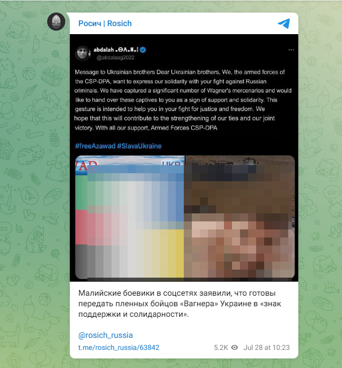 Кроме того, в воскресенье, 28 июля, в соцсетях малийские боевики разместили сообщения о готовности передать пленных вагнеровцев Украине в "знак поддержки и солидарности", передаёт телеграм-канал "Росич".