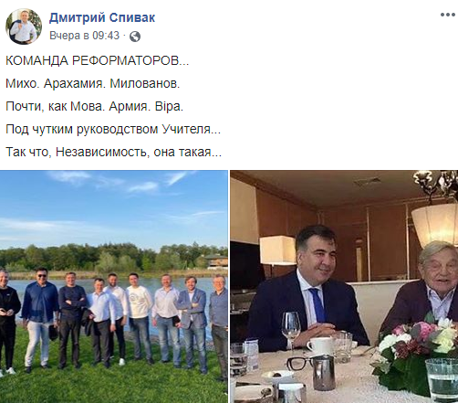 "Команда реформаторов… Михо. Арахамия. Милованов. Почти как Мова. Армия. Віра. Под чутким руководством Учителя... Так что, Независимость, она такая..." - написал он под соответствующим фото на своей странице в Facebook.