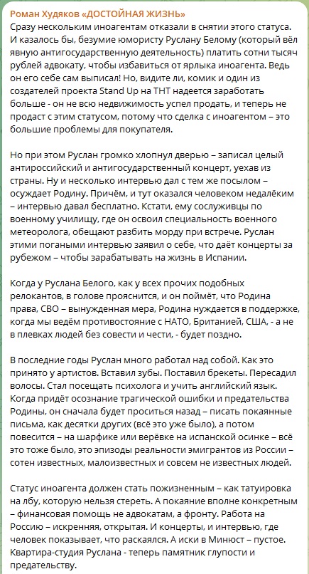 Статус иноагента должен стать пожизненным - как татуировка на лбу, которую нельзя стереть. А покаяние вполне конкретным - финансовая помощь не адвокатам, а фронту. Работа на Россию - искренняя, открытая. И концерты, и интервью, где человек показывает, что раскаялся. А иски в Минюст - пустое. Квартира-студия Руслана - теперь памятник глупости и предательству,
