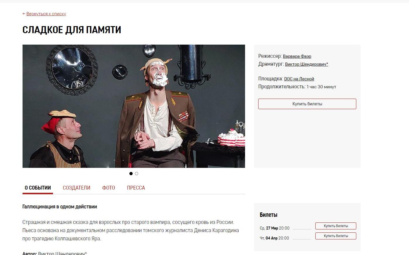 Впрочем, зарабатывать ненавистнику России продолжают помогать и непосредственно в Москве. Так, 27 марта 2024 года в 20:00 в известном "заповеднике" либеральных идей и "искусства", на площадке Театр.doc, предстоял очередной показ спектакля режиссёра Варвары Фаэр "Сладкое для памяти" по пьесе того самого Виктора Шендеровича*.