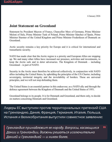 Европа внезапно осмелела и выступила против поползновений США. Скриншот тг-канала Бай Байден