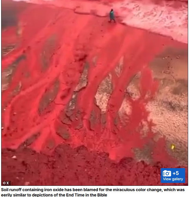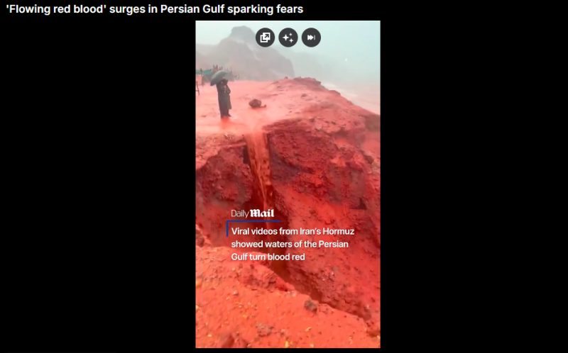 На иранском острове Ормуз разыгралась поразительная картина: ливень окрасился в багрянец, а потоки алой воды, срываясь со скал, вливались в Персидский залив. Вирусные кадры запечатлели, как проливной дождь, смешавшись с почвой, приобрёл насыщенный красноватый оттенок, превратив прибрежные утёсы в каскады "кровавых" водопадов. По данным британского издания Daily Mail, дождь прошёл 16 декабря.