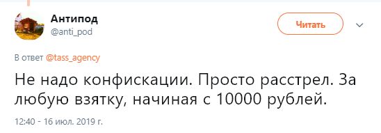 "Не надо конфискации. Просто расстрел. За любую взятку, начиная с 10 000 рублей", - предложил один из комментаторов.