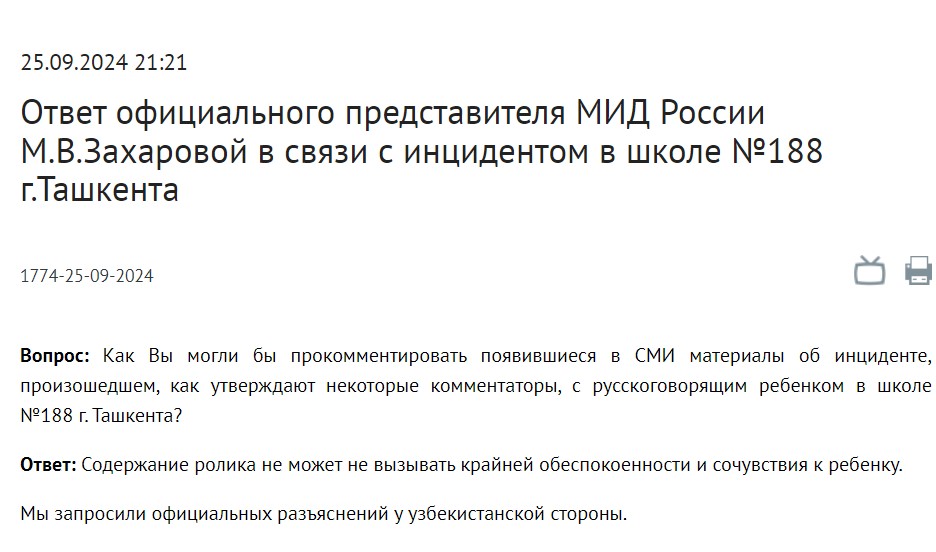 "Содержание ролика не может не вызывать крайней обеспокоенности и сочувствия к ребенку. Мы запросили официальных разъяснений у узбекистанской стороны… К узбекистанской стороне обращена настоятельная просьба дать материалу в СМИ правовую оценку и в случае обоснованности - принять меры к виновнику жестокого обращения с ребёнком. Держим этот вопрос в поле самого пристального внимания", - дала комментарий официальный представитель МИД России Мария Захарова.