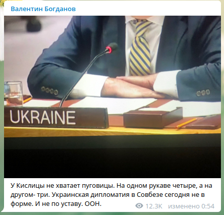 "У Кислицы не хватает пуговицы. На одном рукаве четыре, а на другом- три, - пишет журналист. - Украинская дипломатия в Совбезе сегодня не в форме. И не по уставу. ООН".