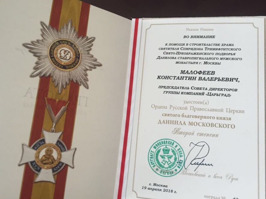 Председатель Совета директоров группы компаний «Царьград» Константин Малофеев удостоен Ордена Русской Православной Церкви святого благоверного князя Даниила Московского Второй степени за помощь в строительстве храма святителя Спиридона Тримифунтского Свято-Преображенского подворья Данилова ставропигиального мужского монастыря Москвы.