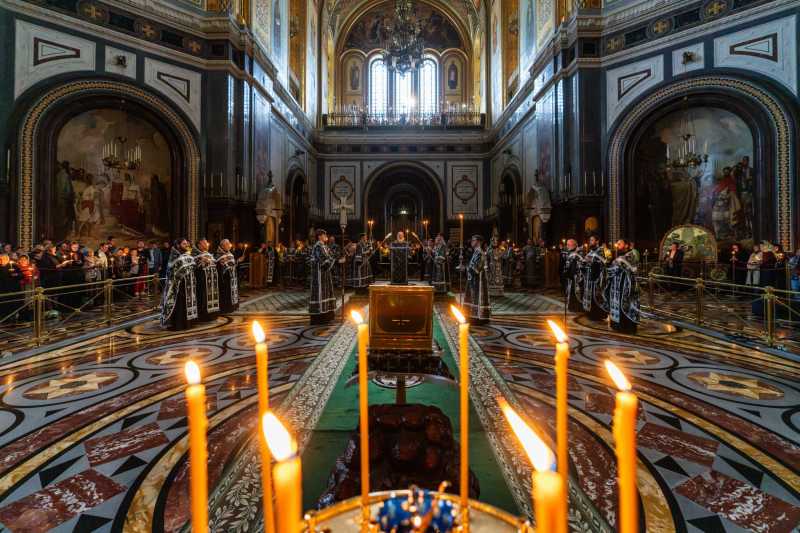 На вечерне Великой Пятницы в православных храмах совершается особый богослужебный чин - Вынос Святой Плащаницы - иконы, изображающей Спасителя, лежащего во гробе. Плащаницу выносят из алтаря и устанавливают в центре храма, после чего верующие благоговейно прикладываются к ней.