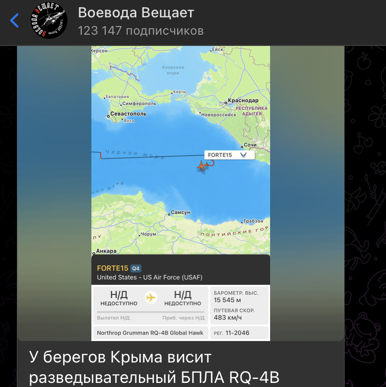 Американский дрон-разведчик RQ-4B Global Hawk, известный как FORTE15, начал патрулирование в районе Чёрного моря, что подтверждают данные сервиса Flightradar. По словам военкора Юрия Котёнка, такая активность в регионе наблюдается уже несколько дней. Причём дроны отключают свои транспондеры при приближении к Крыму.