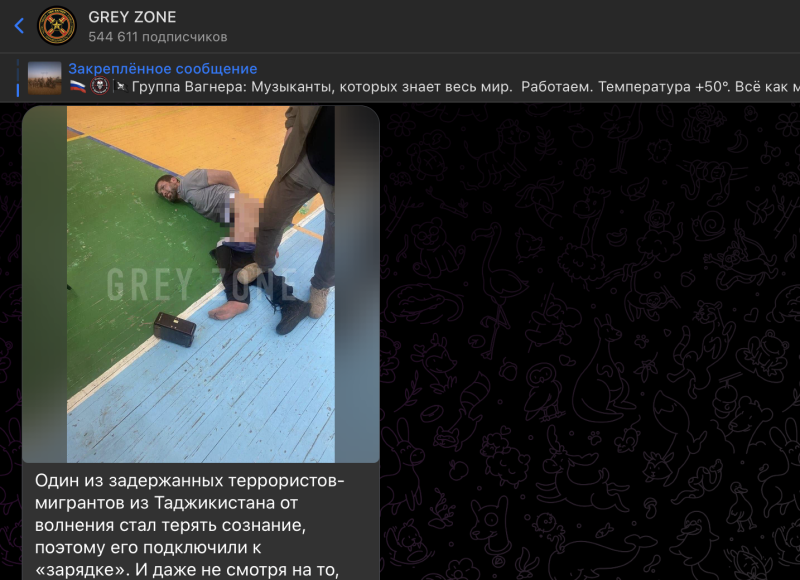 Телеграм-канал Grey Zone, который связывают с ЧВК "Вагнер", выложил фото задержанного террориста, лежащего на полу со спущенными штанами. Предполагается, что к нему подключён военно-полевой телефон ТА-57, который используется для выпытывания правды электротоком.