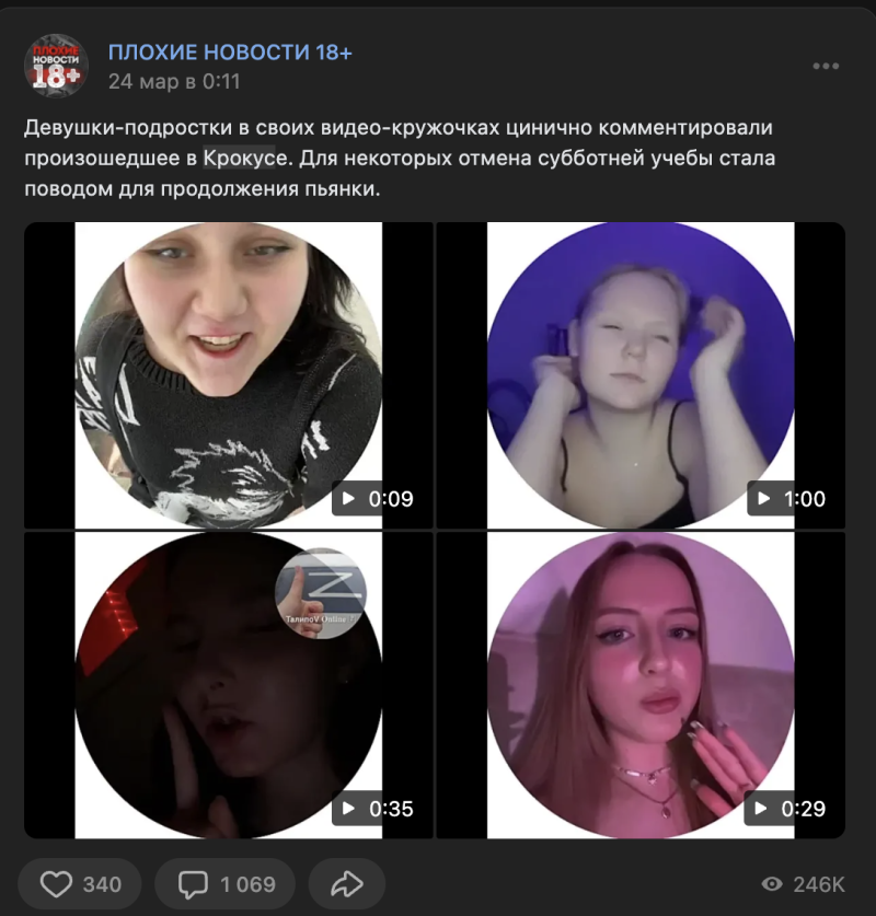 Речь идёт о человеке, который жестоко расстреливал в упор взрослых и детей в "Крокусе". Пока Надя высказывала свои переживания на камеру, она не забывала следить и за своим внешним видом, то и дело проверяя, как выглядят её искусственные ресницы и накачанные губы в кадре. И подобных Наде людей, к сожалению, в нашей стране оказалось немало.