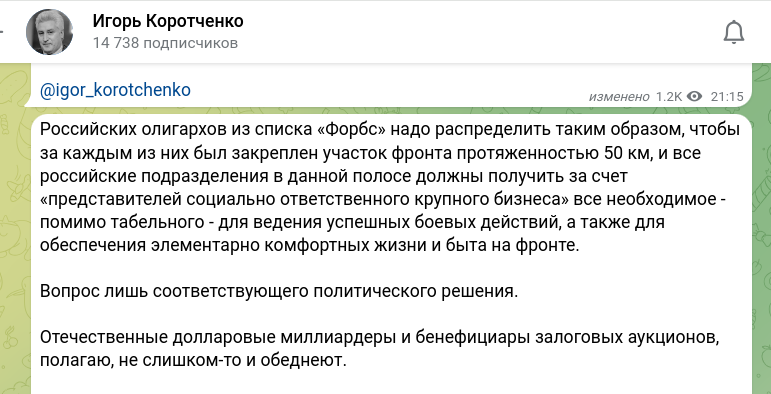 Российских олигархов из списка "Форбс" надо распределить таким образом, чтобы за каждым из них был закреплён участок фронта протяженностью 50 км, и все российские подразделения в данной полосе должны получить за счёт "представителей социально ответственного крупного бизнеса" всё необходимое - помимо табельного - для ведения успешных боевых действий, а также жизни и быта на фронте,