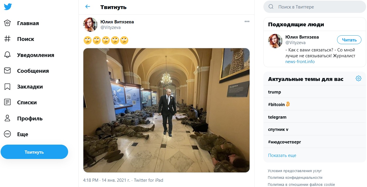 Из фотографии со спящими в Капитолии нацгвардейцами США сделали мем с президентом России Владимиром Путиным. Российский лидер прошёлся среди "сражённых" американских солдат.