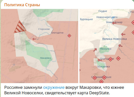 Ранее русские военкоры сообщали, что наши бойцы замкнули окружение вокруг Макаровки, что южнее Великой Новосёлки. Украинские поднимают панику и указывают на присутствие в окружении своих войск.