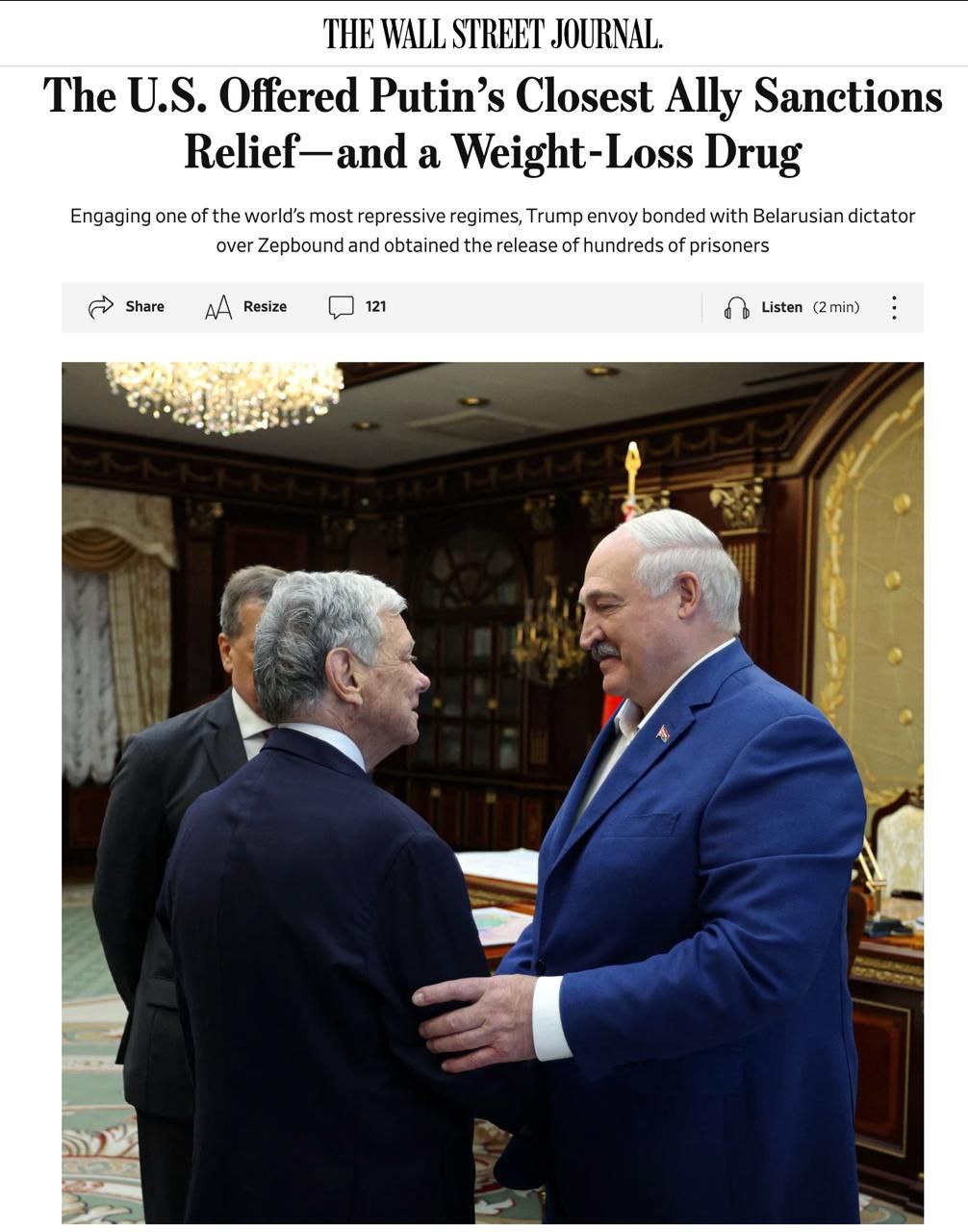 Спецпосланник Трампа сливал водку из рюмки на встрече в декабре с Лукашенко и договорился обменять "политзаключённых" на средство для похудания, пишет WSJ.