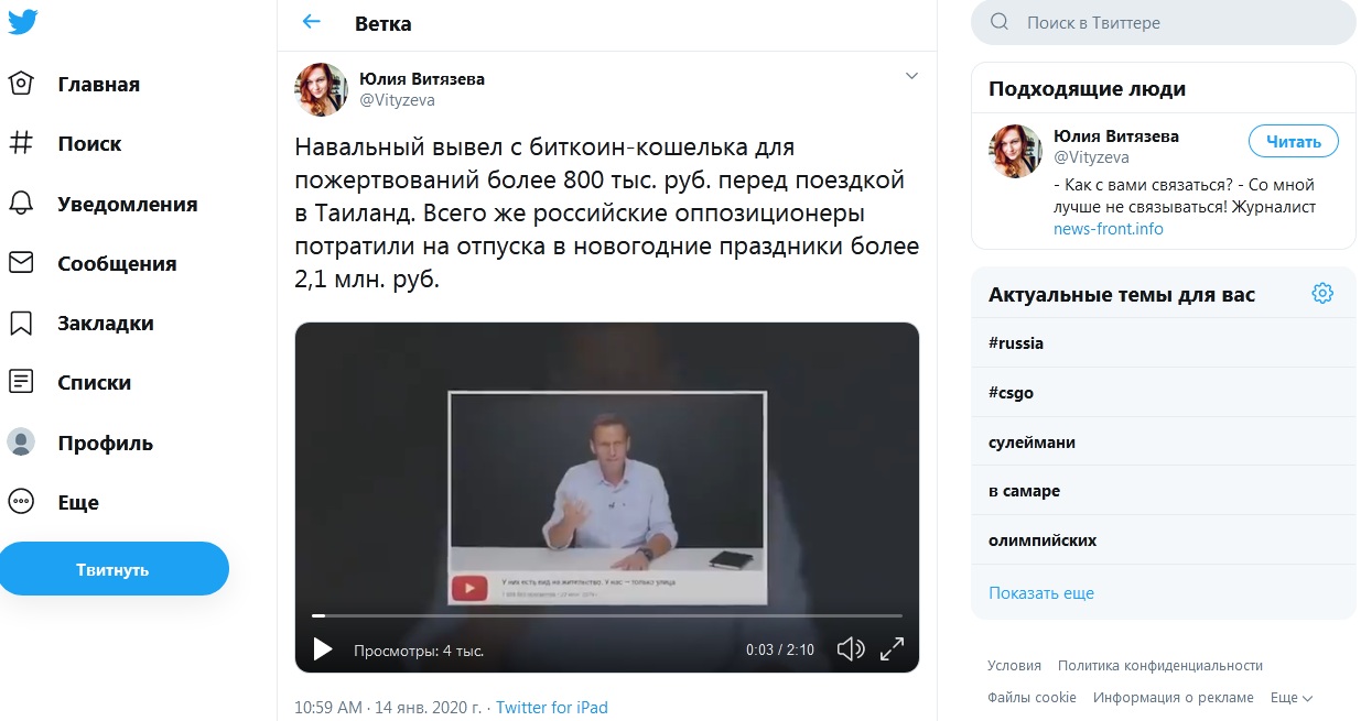 "Навальный вывел с биткоин-кошелька для пожертвований более 800 тыс. руб. перед поездкой в Таиланд. Всего же российские оппозиционеры потратили на отпуска в новогодние праздники более 2,1 млн. руб", - комментирует в Twitter журналистка и блогер Юлия Витязева.