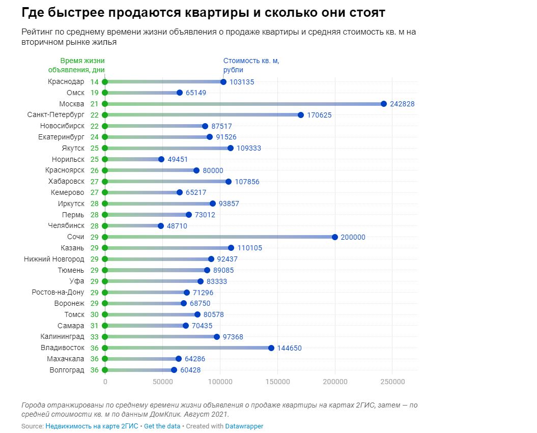 При этом средняя площадь квартир из объявлений на вторичном рынке в Краснодаре, лидере по скорости продаж, чуть меньше московской — 53 кв. м,