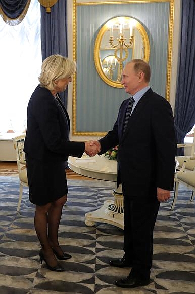 Президент России Владимир Путин принял в Кремле лидера "Национального фронта", кандидата в президенты Франции Марин Ле Пен. Стоит отметить, что встреча не планировалась и не анонсировалась заранее. В Москве Марин Ле Пен находилась по приглашению российских парламентариев.