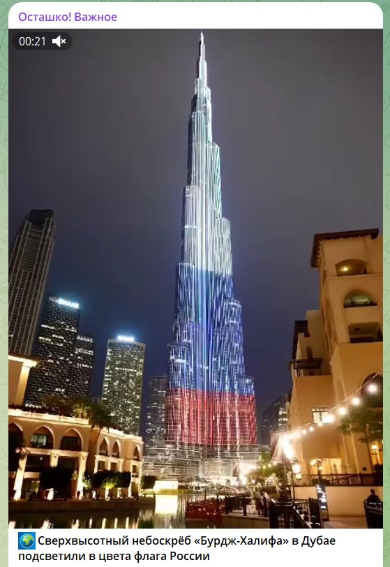 Такие же мемориалы организованы во многих странах мира. И это не только Китай, Индия, другие дружественные нам страны. Это и США, и Британия, и страны ЕС. Самую высокую башню-небоскрёб в Дубае также подсветили в цвета русского флага. Весь мир разделяет горе после страшного теракта.