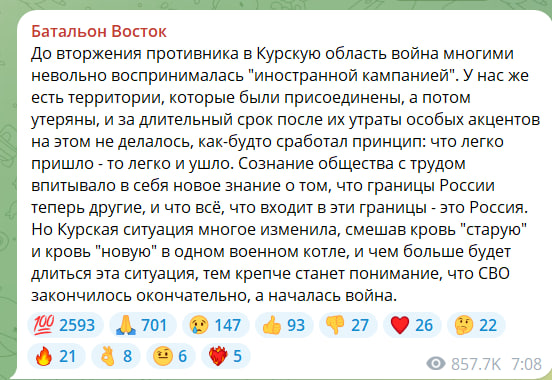 По словам бойцов "Востока", сознание общества с трудом воспринимает новое знание о том, что границы России теперь другие и что всё, что входит в эти границы, - это Россия. Люди не могли это понять, плюс и словосочетание "специальная военная операция" для многих оказалось ново. Однако вторжение противника в Курскую область, уверены бойцы, изменило вообще всё. "Удар" по Курщине задел даже тылы России, "ударной волной" накрыв даже либеральные массы, отстраняющиеся от происходящего последние два с половиной года: