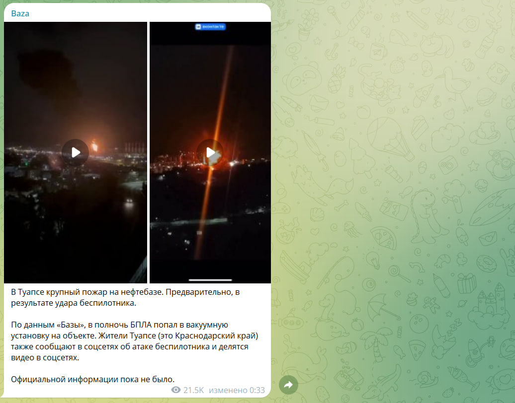 В социальных сетях уже появились первые кадры возгорания, ими делятся очевидцы. На нефтебазе сейчас слышна воздушная тревога.